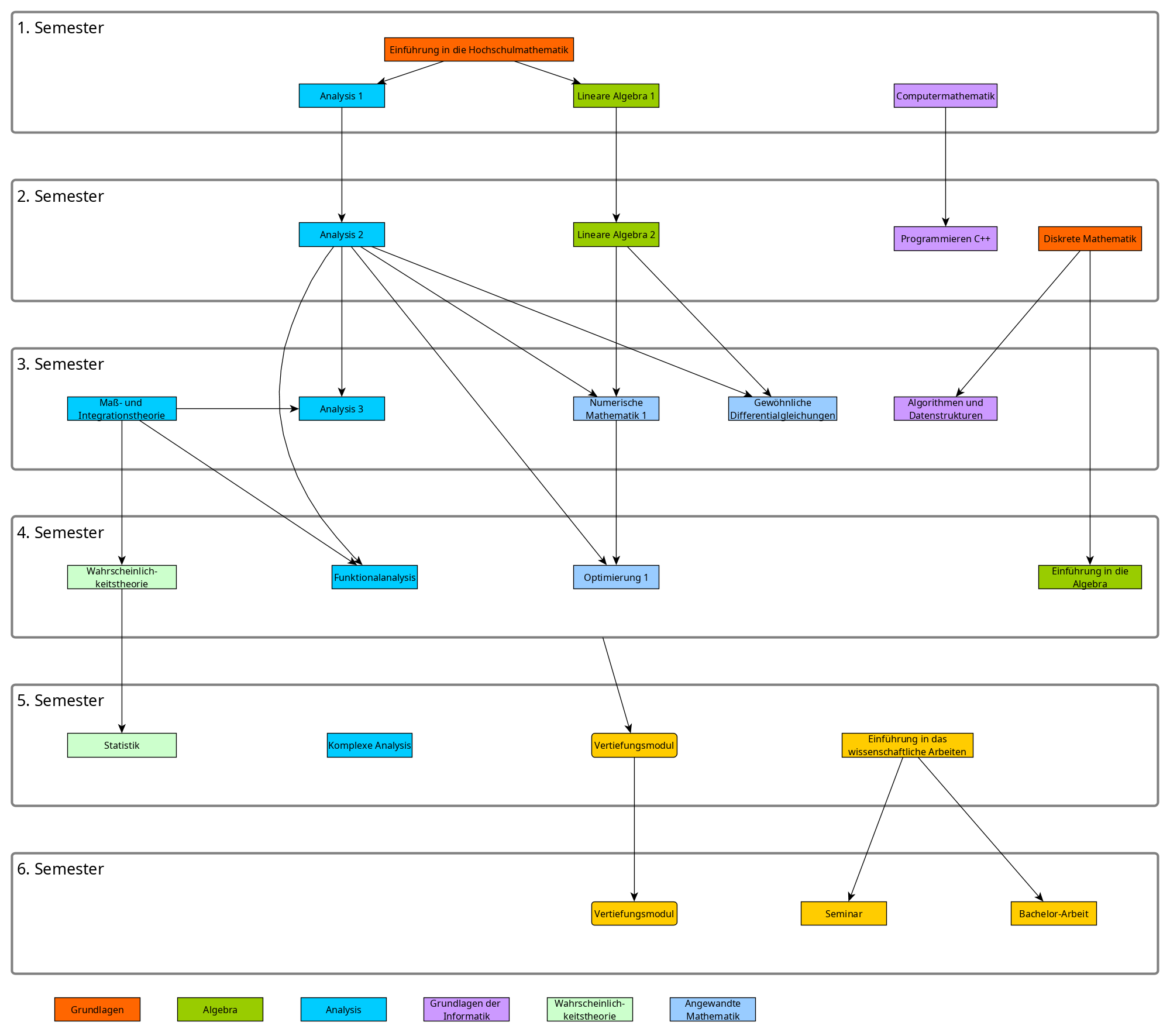 Für die Abhängigkeiten der einzelnen Bachelor-Fächer schau dir mal diese Abhängigkeitsgraphen an (die Abhängigkeiten sind nur fachlich gemeint, keine dieser Lehrveranstaltungen setzt voraus, dass du in vorherigen LVen warst). Du kannst auf das Bild klicken um es zu vergrößern.