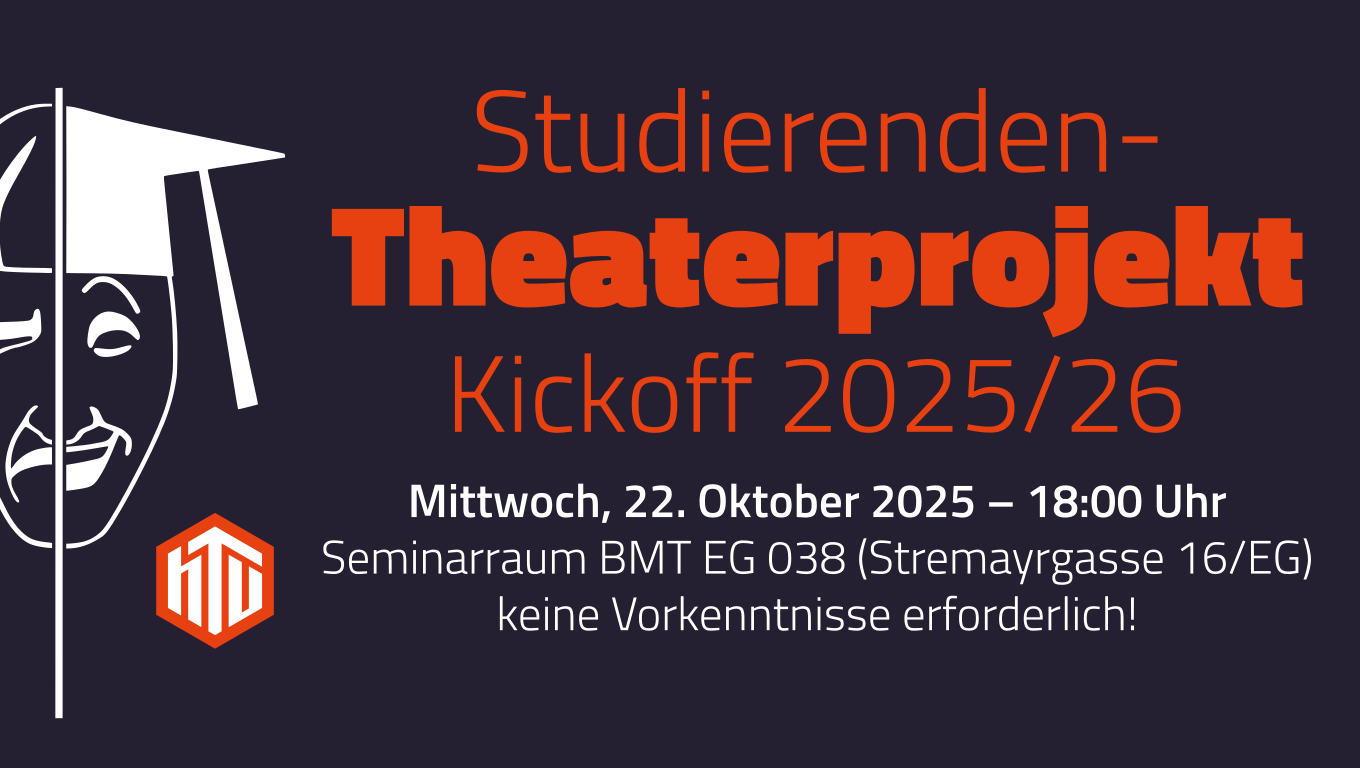 Am Mittwoch, dem 22. Oktober 2025 starten wir in die neue Saison! Ab 18 Uhr treffen wir uns im Seminarraum BMT EG038 in der Stremayrgasse 16. Falls du Interesse hast, komm einfach vorbei, wir freuen uns auf dich! Sollte es sich leider nicht ausgehen, schreib uns gerne eine Mail unter theater@htugraz.at .